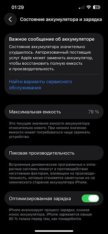 - На скриншоте “Состояние аккумулятора”: максимальная ёмкость 79%(родной), отображается предупреждение о необходимости сервисной замены для восстановления полной ёмкости и производительности.