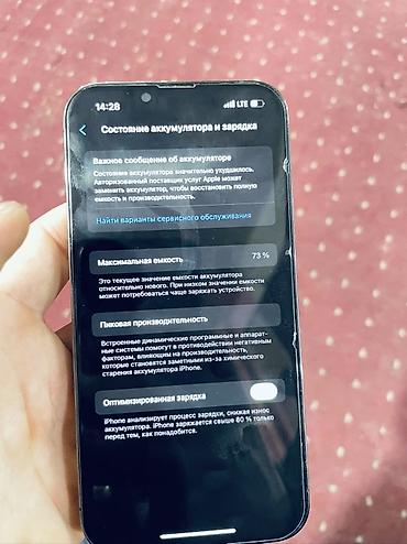 - Аккумулятор: максимальная ёмкость 73% (на экране есть системное сообщение о необходимости обслуживания аккумулятора)