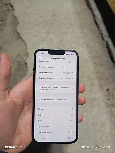 - Экран блокировки и меню «Об этом устройстве» с информацией о модели iPhone 13 Pro (модель MLVD3KH/A) и объёме памяти 128 ГБ