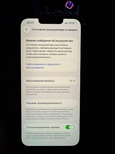 - Состояние аккумулятора по iOS: максимальная ёмкость 75%, в системе отображается рекомендация о замене для восстановления полной производительности