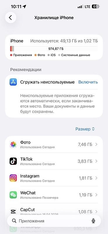 - Память: 1,02 ТБ (скрин из раздела «Хранилище iPhone» прилагается)