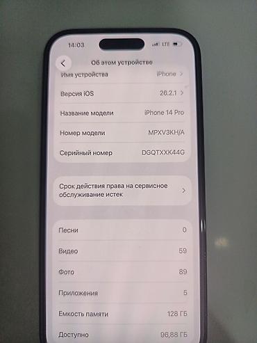 IPhone 14 Pro Max, 128 ГБ, фиолетовый (Deep Purple) - Модель: iPhone 14 Pro Max (указано в настройках) - Память: 128 ГБ, доступно ~112 ГБ - Цвет: Deep Purple - iOS: 26.2.1 на борту - Аккумулятор: ...