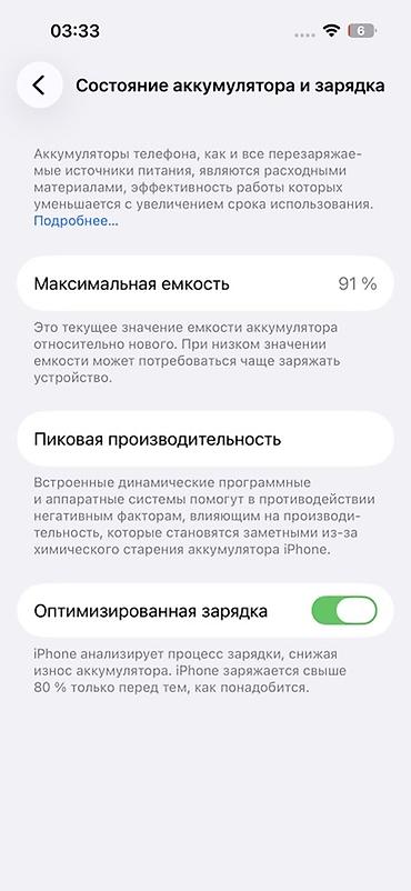 - Аккумулятор: максимальная ёмкость 91%, режим «Оптимизированная зарядка» включён