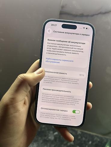 - Аккумулятор: в разделе «Состояние аккумулятора и зарядка» показано сообщение о снижении ресурса, максимальная ёмкость 72%, включена «Оптимизированная зарядка»