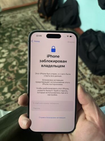 - На экране приветственное окно “hello”; при попытке настройки отображается сообщение: «iPhone заблокирован владельцем. Этот iPhone был утерян… Чтобы разблокировать, укажите Аккаунт Apple и пароль».