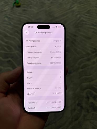 iPhone 15 Pro, 256 ГБ, цвет «натуральный титан». Емкость аккумулятора 87%. В комплекте: коробка и чехол. Использовался аккуратно, без серьёзных падений. Цена: 55000 сом, возможен торг.