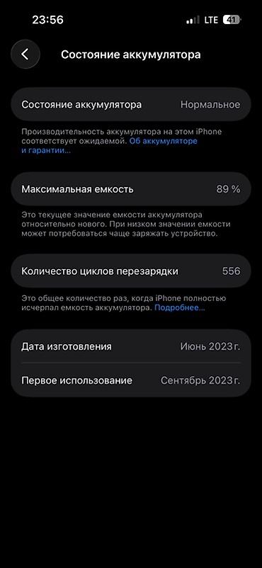- Аккумулятор: состояние «Нормальное», максимальная емкость 89%, 556 циклов перезарядки
