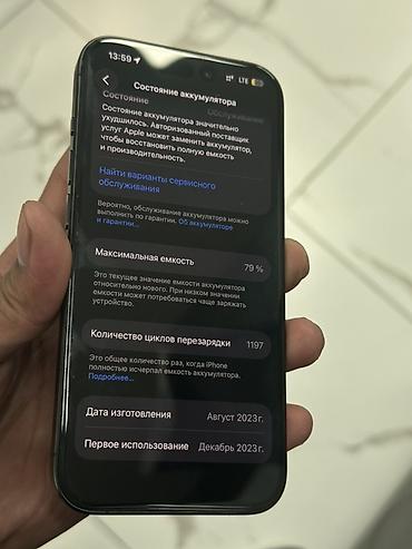 - Аккумулятор: максимальная ёмкость 79%, количество циклов перезарядки 1197, состояние — рекомендуется сервисное обслуживание. Дата изготовления — август 2023, первое использование — декабрь 2023.