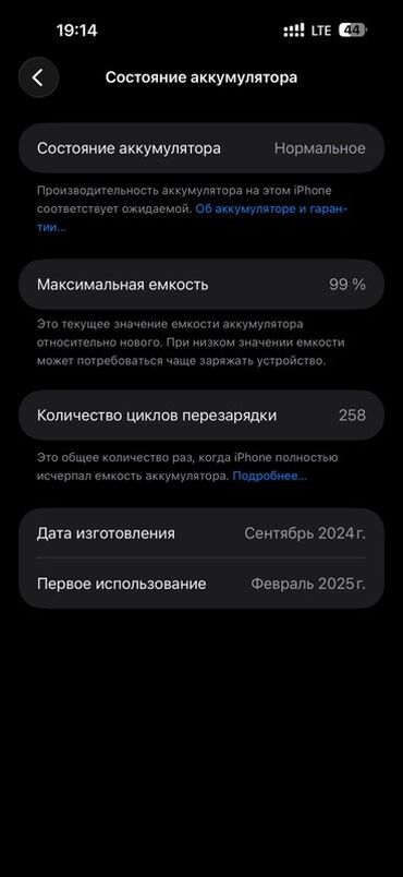 - На скриншоте раздела «Состояние аккумулятора»: максимальная ёмкость 99%, количество циклов перезарядки 258; дата изготовления — сентябрь 2024 г., первое использование — февраль 2025 г.