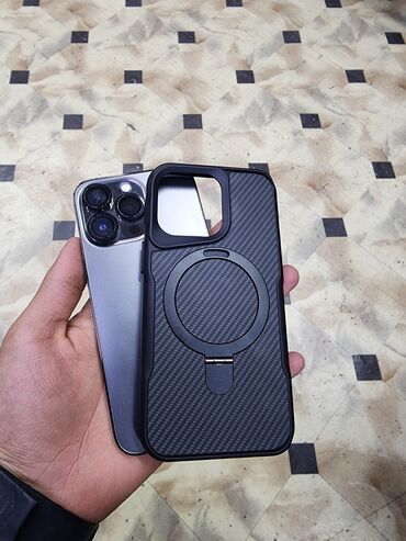 Apple iPhone (серия Pro, цвет тёмный/серый). Комплектация по фото: смартфон и защитный чехол с магнитным кольцом MagSafe и откидной ножкой-стендом.