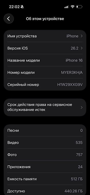 - Память: 512 ГБ, доступно 440,26 ГБ