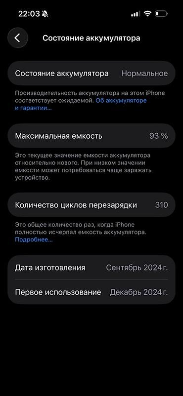 IPhone (серия с Dynamic Island), графитовый/тёмно‑серый цвет корпуса. Характеристики по снимкам экрана: - Память: 128 ГБ - Аккумулятор: максимальная ёмкость 100%(родной), количество циклов переза...