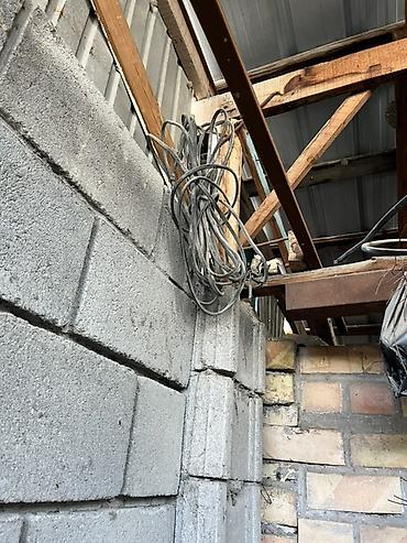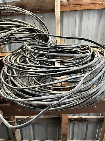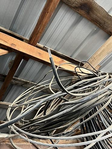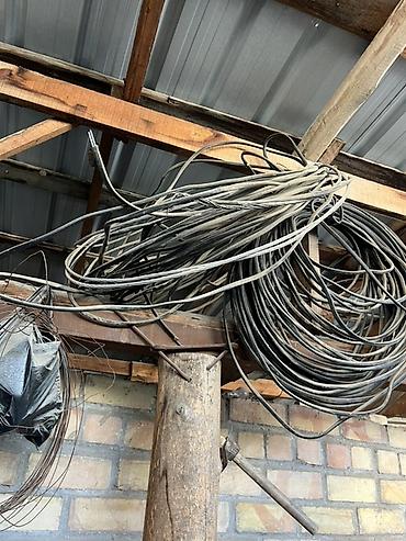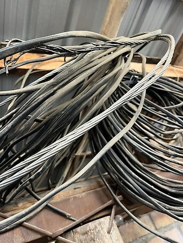 - Разнообразные электрические кабели и провода в изоляции (черная и серая), часть — с стальным/алюминиевым несущим тросом.