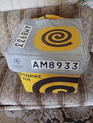 Термоизоляционная сумка для доставки еды от Яндекс Еда. Имеет желто-серый дизайн с фирменным логотипом в виде спирали и надписями «Московский курьер» и «Яндекс ЕДА». Снаружи расположены идентификационные номера «АМ8933». Внутренняя часть выполнена из фольгированного материала, обеспечивающего сохранение температуры продуктов. Оснащена удобными ручками для переноски.