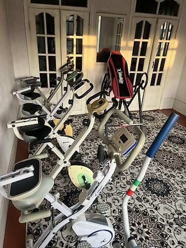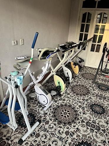 - Складные велотренажёры X‑bike форм‑фактора (несколько штук). Компактная Х‑рама, регулируемая высота сиденья, широкое седло с поручнями/спинкой, педали с ремешками. Магнитная нагрузка с плавной регулировкой. Встроенный бортовой компьютер: отображает время, скорость, дистанцию, калории и пульс (датчики на рукоятках). Транспортировочные ролики.