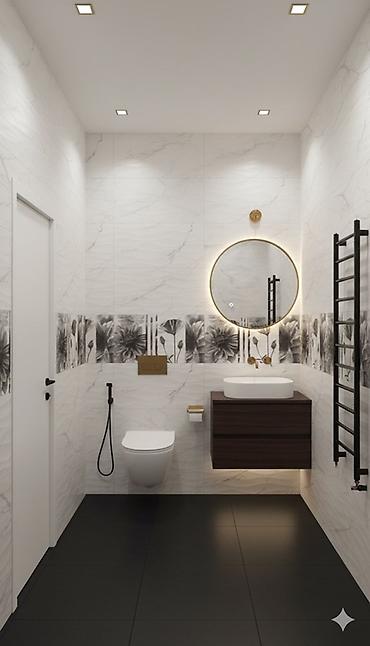 - Дизайны: белый и серый «мрамор» с прожилками, глубокий черный мрамор с контрастными прожилками, графичные декоры с цветочным принтом, однотонные плитки под дерево для пола.