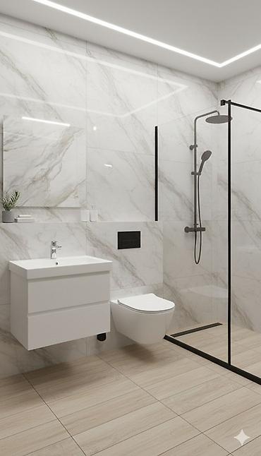 - Совместимость: стеклянные душевые перегородки, скрытые инсталляции, навесные тумбы и сантехника.