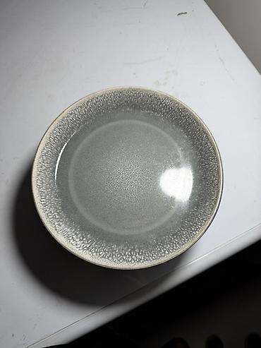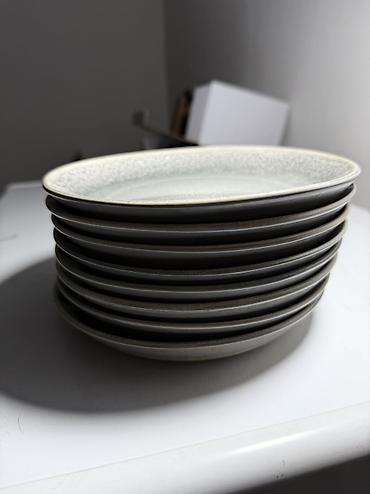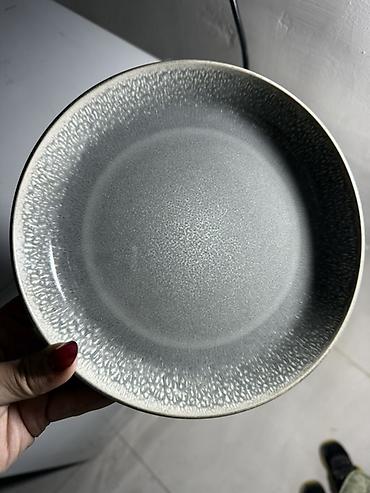 Керамическая тарелка глубокая, серо-графитового цвета с эффектной реактивной глазурью и светло‑серой “крапчатой” окантовкой по краю. В наборе 8 шт . В идеальном состоянии без царапин и сколов.
