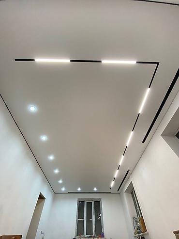 - Встроенное освещение: линейные световые линии (прямые и фигурные контуры), точечные споты, комбинированные схемы. Ровный, яркий белый свет без мерцания, аккуратная геометрия швов и линий.