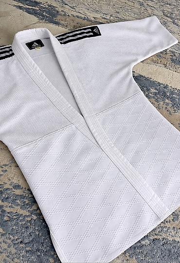- Особенности: прочные плотные лацканы, рельефная ткань, износостойкость в зонах захватов, классический белый пояс в наборе