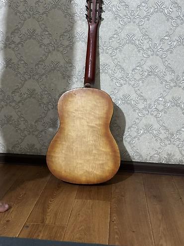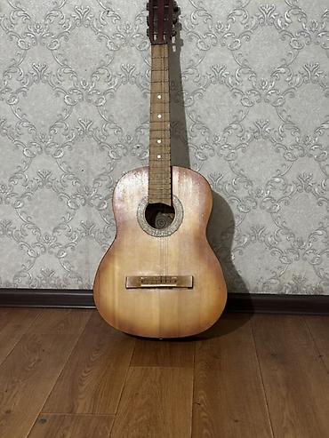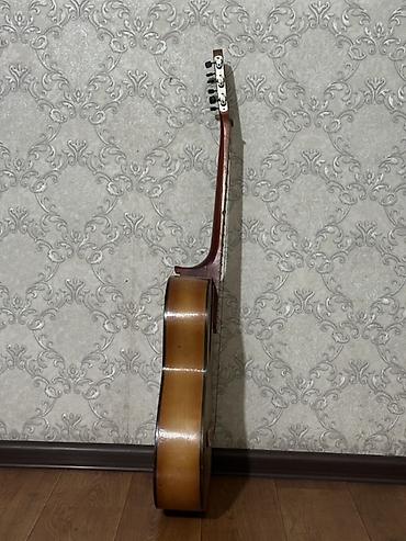 Классическая акустическая гитара с тёплым винтажным оттенком корпуса. Инструмент имеет компактную форму, удобный гриф и классическую розетку вокруг резонаторного отверстия. Отлично подойдёт для начинающих музыкантов, обучения и домашней практики.