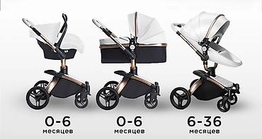 - Трансформируемая система: люлька для 0–6 мес., прогулочный блок для 6–36 мес., установка автолюльки/кокона для 0–6 мес. (по изображению).