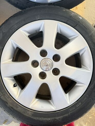 Комплект из 4 легкосплавных дисков с шинами. Характеристики: - Диаметр дисков: ориентировочно 16" (визуально по профилю и дизайну) - Посадочные отверстия: 5 болтов - Центральные колпачки с логотип...
