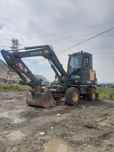 Колесный экскаватор Volvo - Тип: колесный экскаватор - Бренд: Volvo (надпись на стреле и корме) - Оснащение: ковш на быстросъёме, гидролинии на стреле, выдвижная рукоять, опорный отвал/рыхлитель с...