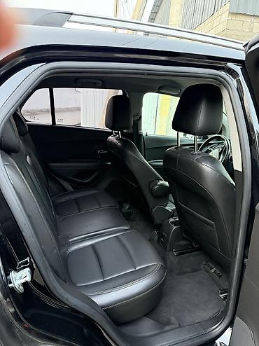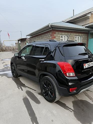 Chevrolet Trax (Trail/Tracker) компактный кроссовер, черный цвет кузова. Версия с пакетом RS/Redline-стиля: черные глянцевые легкосплавные диски, затемненная оптика, черный декор, красные акценты на эмблемах/суппортах. Кузов с рейлингами на крыше и спойлером на пятой двери. Светотехника: задние фонари с прозрачными секциями, дополнительный стоп-сигнал на спойлере, противотуманные фонари в бампере. Задний парктроник. Тонированные задние стекла, повторители поворота в зеркалах. Крышка багажника с электроприводом стекла-омывателем и дворником. Шины дорожного типа на 5‑спицевых дисках, дисковые тормоза по кругу. Клиренс городской, пластиковый обвес для защиты порогов и бамперов. Пятидверный салон, раскладная спинка второго ряда, багажник с низкой погрузочной кромкой. Бензиновый переднеприводный/полный привод в зависимости от комплектации (семейство моторов 1.4T/1.8, АКПП). Подходит для города и пригородных поездок, экономичный и маневренный, с высоким посадочным местом и хорошим обзором.
