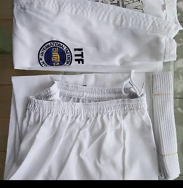 - Добок ITF: куртка с вышивкой ITF и эмблемой International Taekwon‑Do Federation, брюки на резинке, белый пояс.