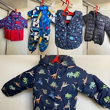 - Утеплённые куртки с капюшоном: синие с динозаврами, красно‑синяя с принтами, стёганая чёрная, стёганая синяя с машинками.