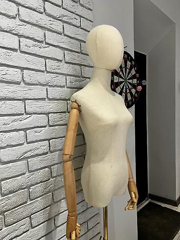 - Женский портновский/витринный манекен на стойке: торс обтянут светлой тканью, подвижные деревянные руки с шарнирами для постановки жестов; подойдет для демонстрации платьев, жакетов, блузок и аксессуаров.