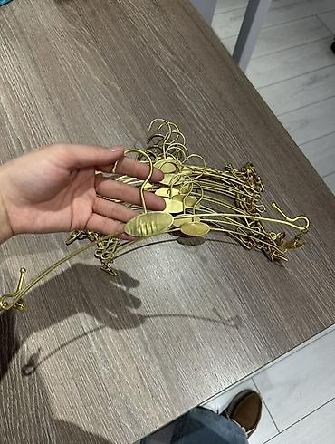 - Металлические вешалки-плечики цвета золота с зажимами для юбок/брюк. Тонкая проволочная рамка, поворотный крючок, по краям по одному прищепному зажиму. На перекладине — овальная площадка под стикер или размерник. Легкие, экономят место на рейле.