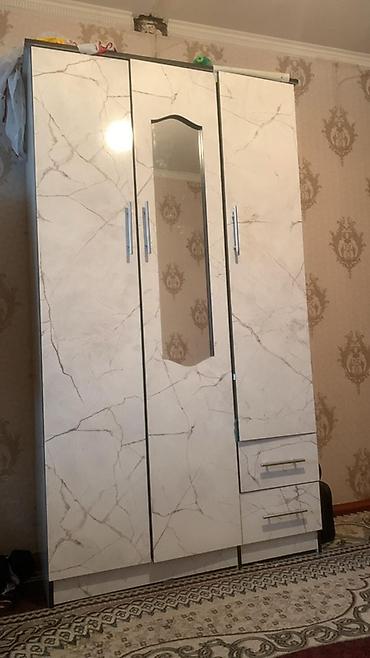 - Трёхдверный платяной шкаф с фасадами под светлый мрамор, центральное зеркало, длинные вертикальные ручки. В нижней части — два выдвижных ящика. Внутри — секции для вешалок и полок (по конфигурации видно разделение на отделения).