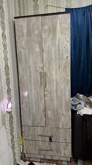 - Двухдверный платяной шкаф в сером древесном декоре, с тремя нижними выдвижными ящиками и прямыми металлическими ручками. Оптимален для одежды, белья и аксессуаров.