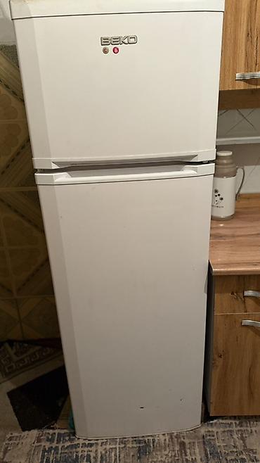 - Холодильник BEKO, классический двухкамерный с верхней морозильной камерой. Механическое управление, индикаторы на панели, удобные горизонтальные ручки. Компактная ширина — удобно для небольшой кухни.
