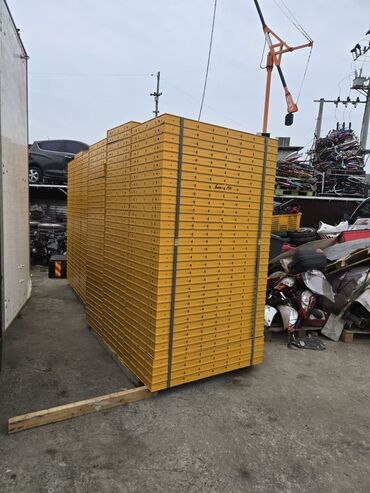 Партия желтых опалубочных щитов. Эти прочные и надежные элементы используются для создания форм при строительстве бетонных конструкций. Щиты аккуратно сложены и готовы к транспортировке на строител...