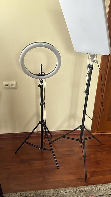 - Кольцевая LED‑лампа на штативе. Диаметр кольца — около 30–35 см. Есть держатель/крепление по центру для установки смартфона/камеры. Регулируемая высота стойки, наклон головы, питание от сети через провод.