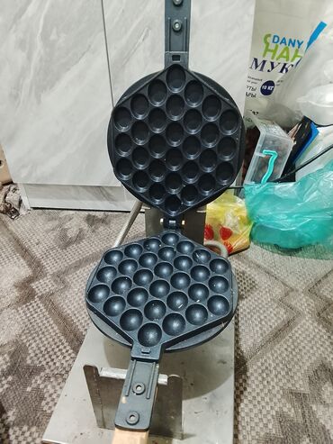 - Формовая сковорода/вафельница для bubble waffles (яйчные «пупырчатые» вафли) на поворотном кронштейне. Две алюминиевые формы с полусферическими ячейками, ручки с термозащитой.
