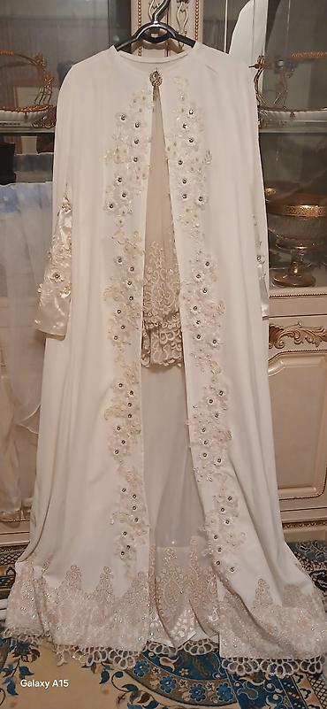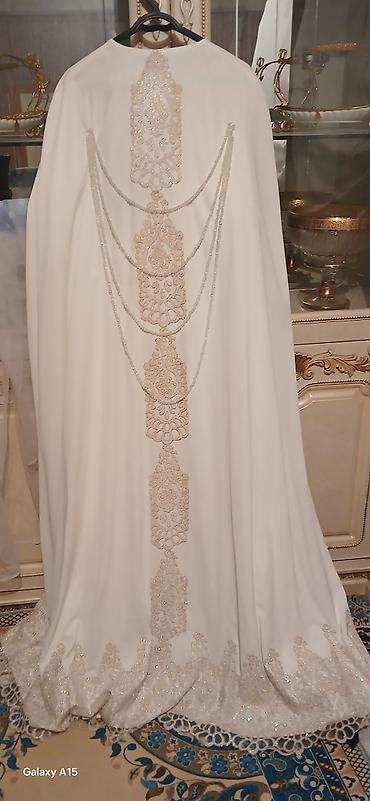 Нарядный восточный комплект: длинное белое платье-абайя/накидка с богатым декором + черные ботильоны на каблуке.