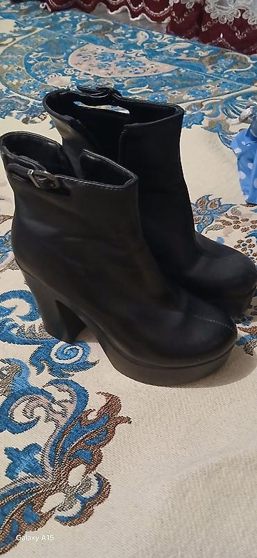 - Черные ботильоны на устойчивом фигурном каблуке и платформе.