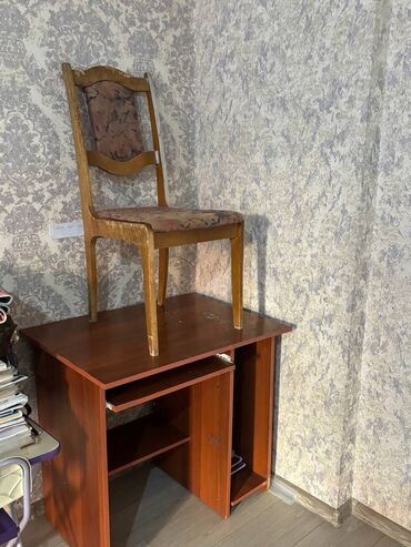- Стол из ЛДСП под дерево (тёплый красно-коричневый тон).