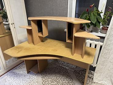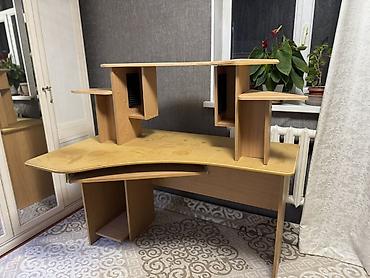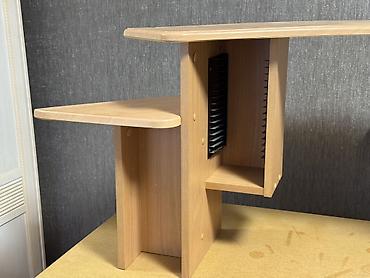 - Верхняя надстройка во всю длину стола: центральная полка под монитор, две боковые полки для колонок/аксессуаров.