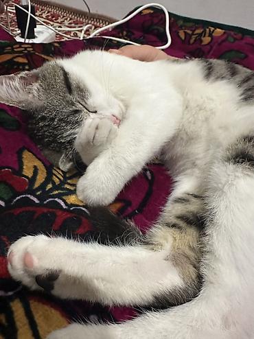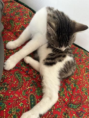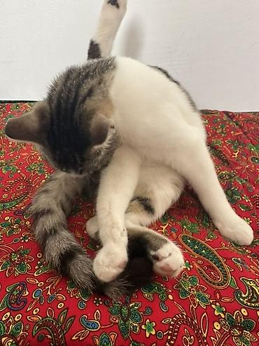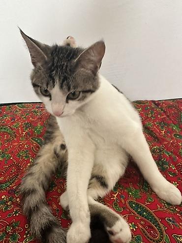Короткошёрстный котёнок с ярким тигрово-белым окрасом. Контрастная шапочка и спинка с табби-полосами, белая мордочка, грудь и лапы. Большие выразительные уши, длинный пушистый хвост с тёмными кольцами. Активный, гибкий, любит умываться и тянуться, аккуратно пользуется лапами. Подходит для домашнего содержания: неприхотлив к уходу, легко приучается к лотку и когтеточке, ладит с мягкими лежанками и пледами. Прекрасный компаньон для семьи: игривый, ласковый, хорошо переносит внимание, любит сидеть рядом и мурлыкать. Отлично смотрится на контрастных текстильных фонах, дружелюбен к фотосъёмке.