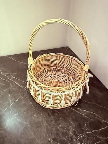 2) Плетёная круглая корзина из лозы с высокой ручкой. Декор по бортику – плетёная тесьма с кисточками. Удобна для хранения рукоделия, фруктов, косметики, сервировки или фотозон.
