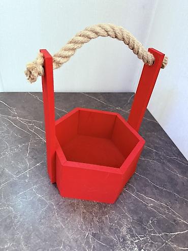 1) Красный деревянный вазон-кашпо шестиугольной формы с толстой джутовой ручкой. Подходит для сухоцветов, мини-композиций, хранения мелочей. Яркое матовое покрытие, устойчивое основание.