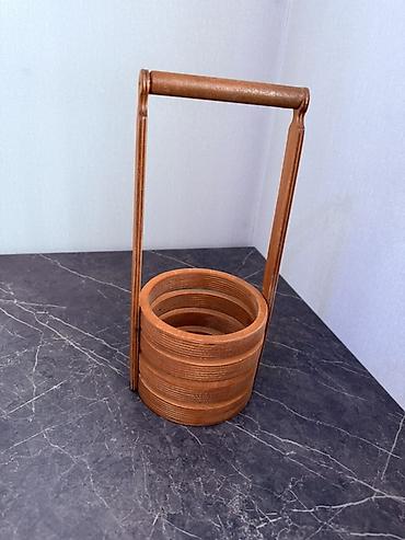 3) Деревянный цилиндрический органайзер с поперечными кольцевыми насечками и жёсткой переносной рукоятью. Внутри несколько круглых секций-«ступенек»; можно использовать как подставку для столовых приборов, кистей, канцелярии или как декоративное кашпо.