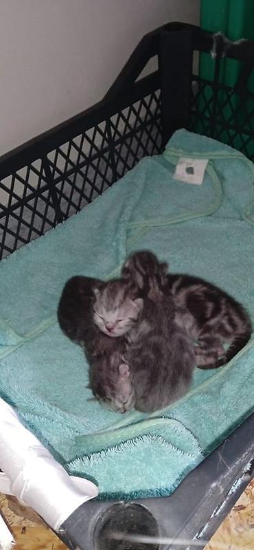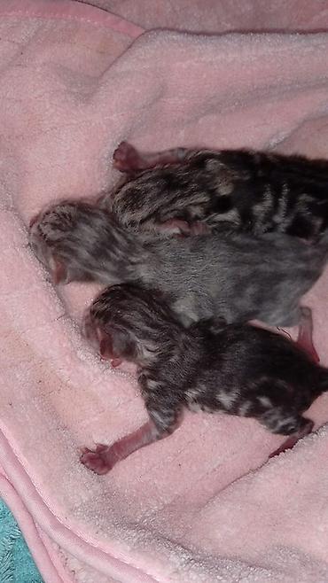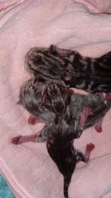 - Помет из нескольких малышей; на фото видны характерные полосы и «мрамор» по корпусу и хвосту.