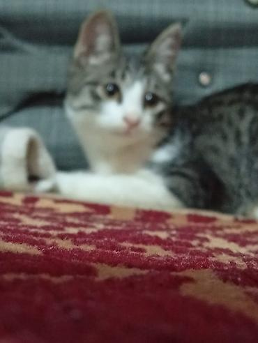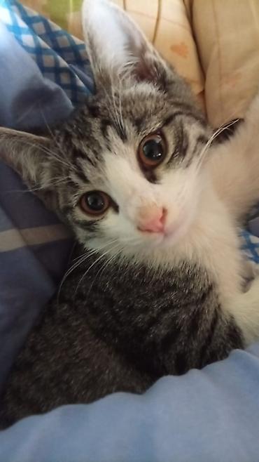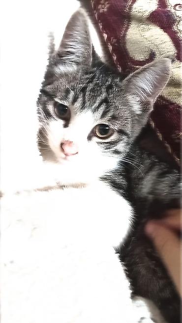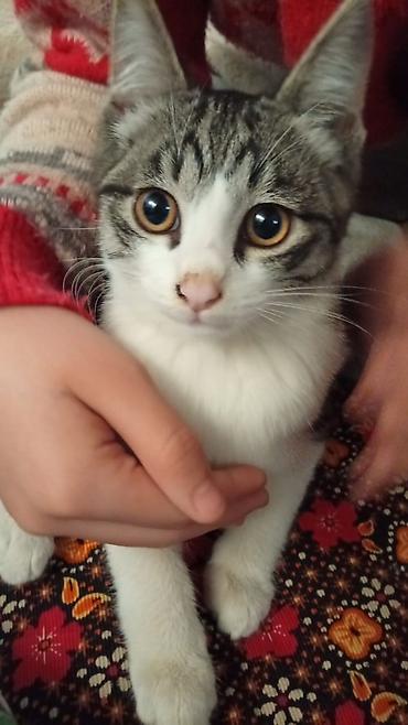 Игривый котёнок с классическим тигровым окрасом (серо-чёрные полоски) и белой грудкой/лапками. Большие выразительные янтарные глаза, розовый носик, аккуратные ушки. Ласковый, контактный, любит сидеть на руках и урчать, быстро привыкает к людям. Активный, с охотничьими повадками — с удовольствием играет с мячиками и шуршащими игрушками. Подходит для квартиры: аккуратный, пользуется лотком после приучения, хорошо ест влажный и сухой корм по возрасту. Шерсть гладкая, не слишком длинная, легко ухаживать — достаточно периодически вычёсывать. Отличный друг для семьи и компаньон для детей: терпеливый и нежный в общении.