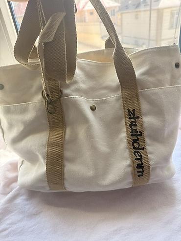 - Ручки и нашивные ленты: прочная тесьма бежевого цвета.